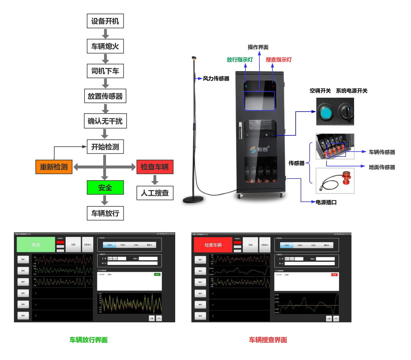 微震人员检查系统是一种利用微小震动传感信号对车厢内藏人员进行探测 的设备,该设备适用于监狱、边防、公共安全等领域对车内藏匿人员进行检查。 车辆内部藏匿有人的时候,藏匿者的心脏会产生有节律的跳动,此震动会 传递到车辆底部和支撑系统上,通过连接传感器与被检车辆,将此震动采集并通 过数据线缆传递回数据分析设备,由软件进行分析,分析软件运算范围精确集中 在心脏跳动的频率范围内,以这种震动分析为基础,在显示终端上可明确显示是 否有人存在,并伴随声光报警。